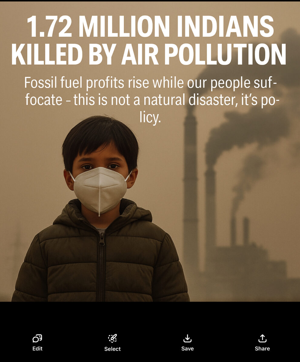 A new Lancet Countdown report lays bare India’s most silent massacre — 1.72 million lives lost in 2022 due to air pollution. Behind these deaths lies a toxic web of fossil fuel addiction, corporate lobbying, and political apathy. The study exposes how the Indian government continues to subsidize coal and oil giants, while public hospitals crumble under the weight of respiratory diseases. From Delhi’s choking smog to rural coal belts, millions breathe poison daily, and the state calls it “development.” The crisis is not accidental — it’s manufactured by policies that privilege profit over people.