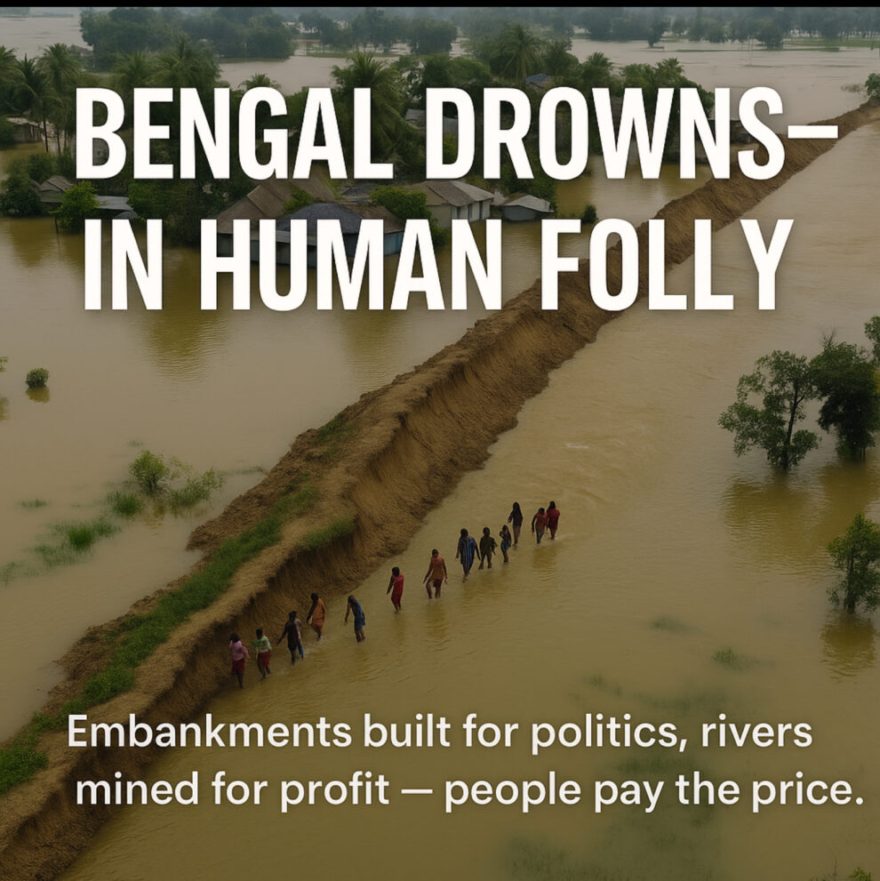 This year’s devastating floods across West Bengal are not an act of nature — they are a man-made disaster born of reckless politics and profit-driven policies. Embankments built for votes, sand mining that lines private pockets, and the destruction of river floodplains have all turned Bengal’s fertile delta into a watery grave for its people. As rivers burst their banks, entire villages are being erased, while the state remains deaf to the cries of those displaced. This crisis exposes how corporate greed and political indifference together worsen climate breakdown — and how ordinary citizens pay the price. Bengal’s tragedy is India’s warning: when governments serve capital instead of communities, floods are never “natural”.